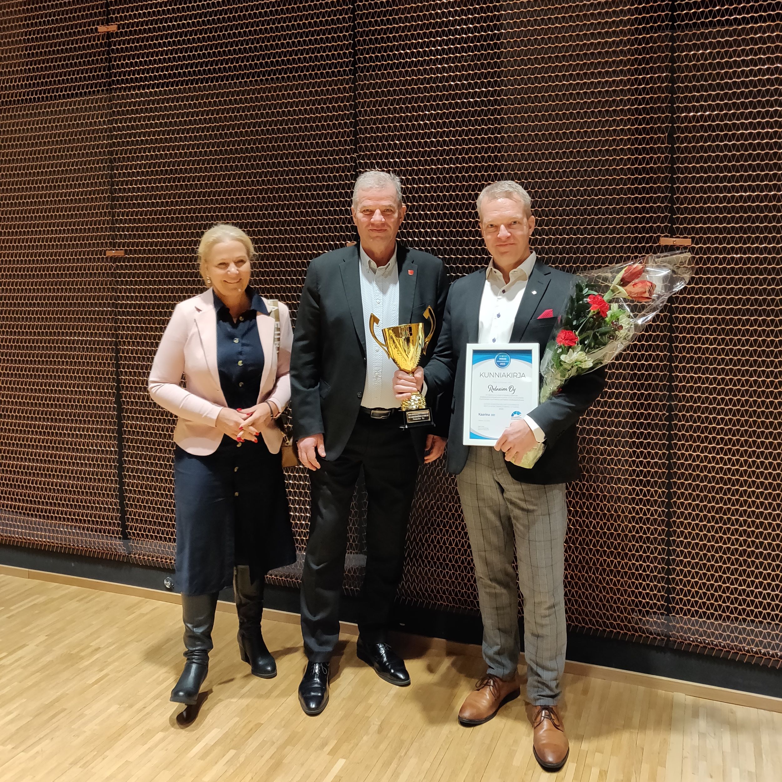Kaarinan Kehityksen Niina Sjöholm ja kaupunginjohtaja Harri Virta onnittelivat Relaxionin Samu Kaukorantaa.