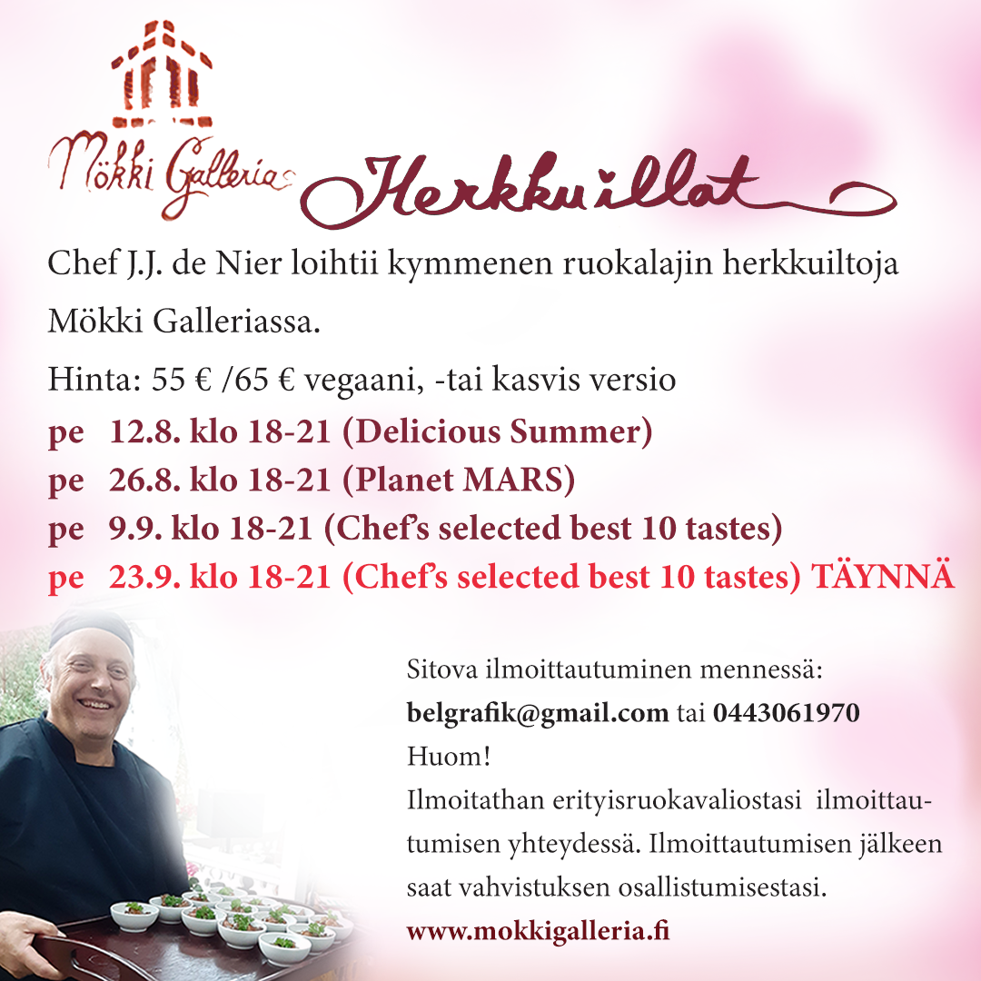 Herkkuiltojeni kokki on kesät hyvin kiireinen, mutta elokuun illat varmistuvat lähiaikoina. Hän on alkuperältään eteläafrikkalainen huippukokki, toiminut alalla 30 vuotta. Tutustuin häneen aikoinaan rotaryklubissa, kun hän oli juuri muuttanut Suomeen. Hänetkin toi suomeen rakkaus kauniiseen suomalaiseen naiseen. Hän on ihana, kun hän hyväksyy hulluimmatkin ideani! Meillä on ollut esimerkiksi Maria Antoinette –ilta Versaillesin henkeen ja Ten Tastes from Ten Countries -menu.