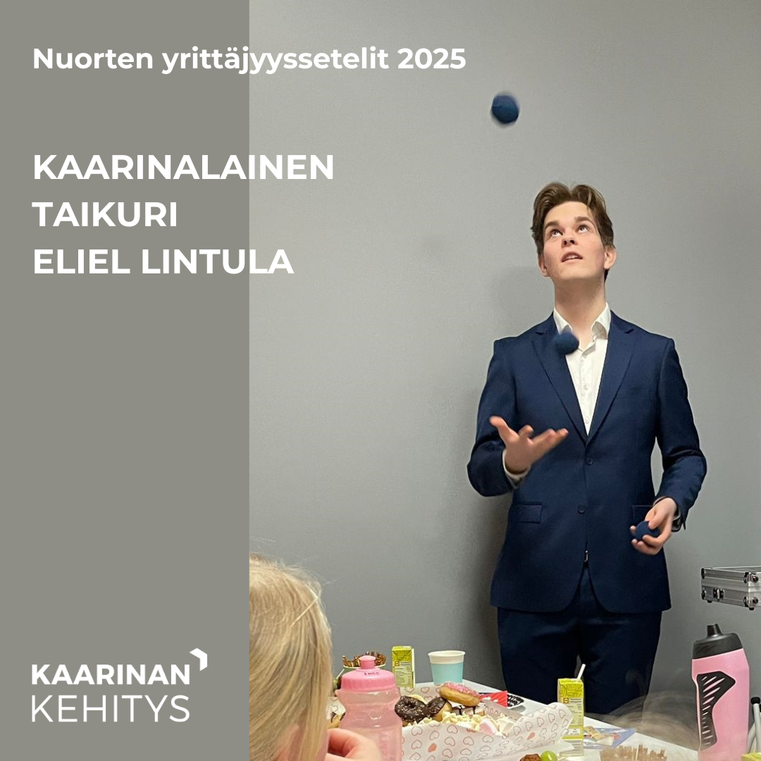 Kaarinan Kehityksen myöntämä yrittäjyysseteli oli Elielille iso apu. Hän käytti sen toiminimen perustamiskuluihin, nettisivujen rakentamiseen ja uusien taikurivälineiden hankintaan. Ilman seteliä kynnys aloittaa olisi ollut korkeampi – nyt alkuun pääseminen tuntui helpommalta.
